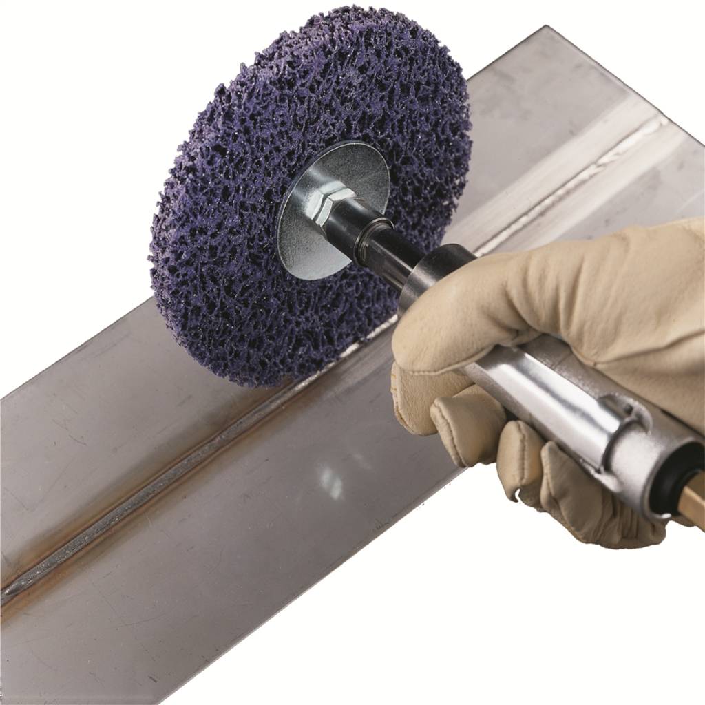Take Advantage of High Conformability. With its re-engineered fiber, the Scotch-Brite? Clean and Strip XT Pro Disc allows operators to take advantage of all the benefits that come with increased conformability without compromising strength. With increased conformability, this disc achieves a larger contact area with the workpiece for faster removal rates. It also conforms to weld bead ripples to polish welds without removing them and works in hard-to-reach areas without damaging the substrate. In addition to its high conformability, the Scotch-Brite? Clean and Strip XT Pro Disc offers low vibration, decreased chunking, low spark, a high speed rating and long life. That all adds up to a disc you can spin onto your angle grinder with confidence. To engineer our Scotch-Brite? Clean and Strip XT Pro Disc, silicon carbide mineral is combined with non-woven nylon fibers using resin. Silicon carbide is a very sharp synthetic mineral commonly used in low-pressure applications like paint prep. The resin bond strengthens the disc and gradually breaks down to reveal new fibers and sharp mineral ? delivering a consistent cut over the life of the abrasive. The combination of fiber strands, resin and abrasive mineral forms a thick, open web. The spring-like nature of the fibers responds to contours and effectively removes unwanted burrs, soils, and contaminants while maintaining the geometry of the workpiece, which in turn reduces rework and boosts productivity. Gaps in the web allow swarf to escape, minimizing loading of the abrasive. Applications include rust removal, paint removal, mill scale removal, coating removal, adhesive removal, and surface preparation.